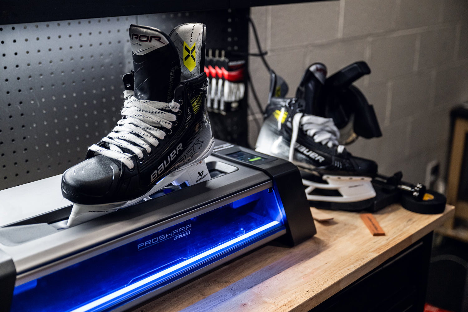 PROSHARP BAUER ADVANTEDGE skøytesliper gir alle muligheten til å slipe skøytene sine med profesjonell presisjon ved å trykke på en knapp. Med automatisert fastspenning, inn- og utgangspunkter og sliping kan du eliminere risikoen for manuelle feil og i stedet få konsistente, nøyaktige resultater hver gang stålene dine må slipes.