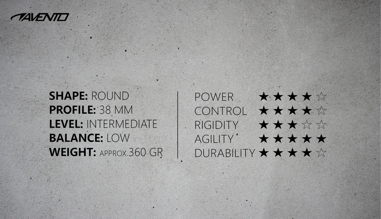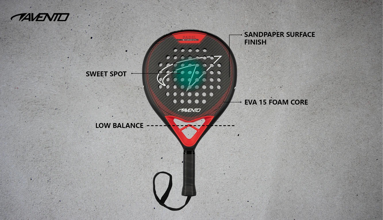 Gå for optimal hastighet og kontroll. Conquista-padelracketen har en rund form og en 3K karbonramme. Rackethodet er 38 mm tykt og kjernen er laget av høykvalitets EVA 15-skum. Overflaten på racketen har en matt, slipt "sandpapir" -finish som gir deg et ekstra godt grep om ballen. Det ideelle treffpunktet til denne racketen, også kalt "sweet spot", er i midten. Dette gir deg god kontroll over ballen. Den "lave balansen" til denne modellen gjør det lettere å håndtere racketen og gir mer manøvrerbarhet. Avento Conquista-racketen er utstyrt med et smart "hullsystem", som reduserer motstanden og øker hastigheten. Conquista-racketen gir deg maksimal manøvrerbarhet og, takket være det robuste 3K Carbon-materialet, også mye kontroll. Takket være den solide broen til denne racketen, absorberes vibrasjoner godt og racketen føles balansert. Denne slitesterke racketen har et tapet grep og er utstyrt med en håndleddsstropp som du bruker racketen med mens du spiller.