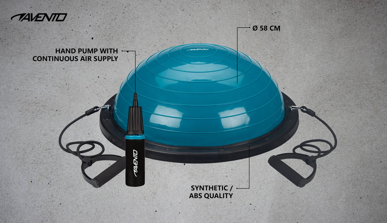 Avento balansetrener er den ultimate måten å komme i form på. Så snart du står på balansetreneren, utfordrer den dynamiske overflaten balansen, holdningen og muskelstyrken din. Med et bredt spekter av forskjellige, utfordrende øvelser kan balansetreneren brukes til mange typer trening. Forleng treningen ytterligere ved å bruke ustabilitetsbrettet med den konvekse siden vendt opp og ned. Styr ulike muskler i kroppen, inkludert kjernemuskulaturen, som ligger i magen og ryggen, og forbedrer styrken og balansen. Denne balansen halvkule er mye brukt av idrettsutøvere, personlige trenere og fysioterapeuter. Avento balanseballskive kommer med avtagbare motstandsbånd, som du også kan trene armer og skuldre med. Balansetreneren kan enkelt blåses opp med den medfølgende pumpen. Balansetreneren passer maksimalt ca. 100 kg.