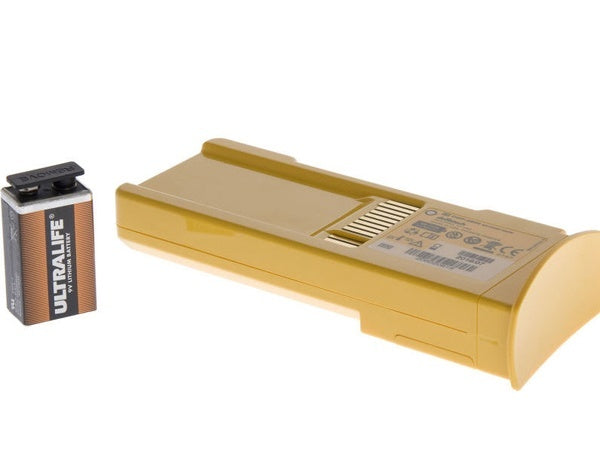 Batteri med opptil 7 års levetid i normaltemperatur, 300 støt og trenger ikke byttes etter bruk. Når varsel for batteriskifte kommer er det fortsatt 6 støt igjen i batteriet. Det medfølgende 9 volt lithiumbatteriet passer i et rom i hovedbatteriet og sørger for enhetens daglige, ukentlig og månedlige egenkontroll. Disse testene tapper altså ikke hovedbatteriet.