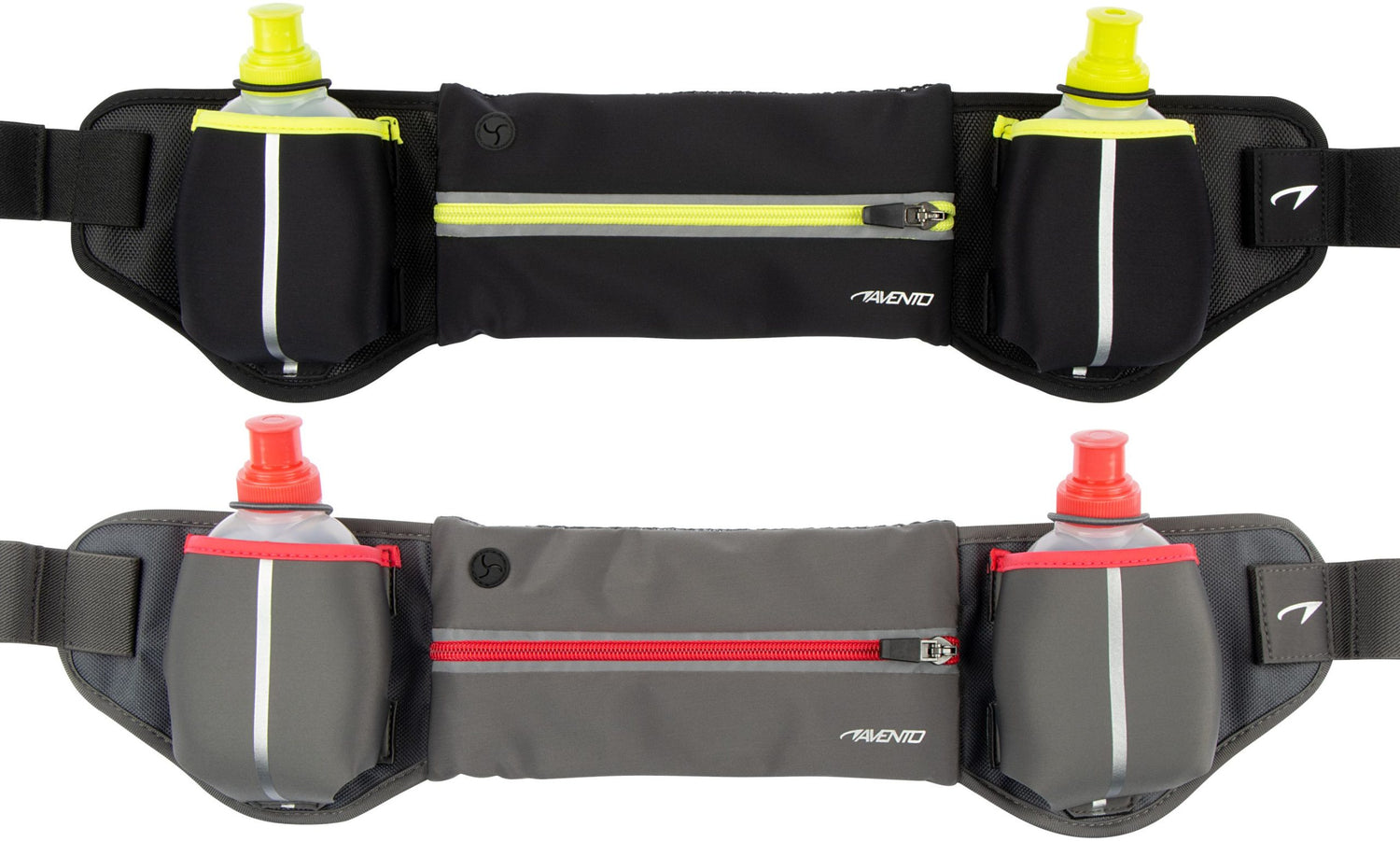Avento løpe belte med to drikkeflasker. Beltet er komfortabelt og laget i polyester og er vann-avisende. På grunn av siliconbiter holder beltet seg fast mens du er ute å løper. Det medfølger en praktisk lomme hvor du kan lagre en telefon, lommebok, eller nøkler. Beltet har refleks noe som gjør deg mer trygg når du er ute å løper. De 2 medfølgende flaskene er på cirka 190ml per flaske. Passer godt for løpende, de som liker å gå tur og skatere.