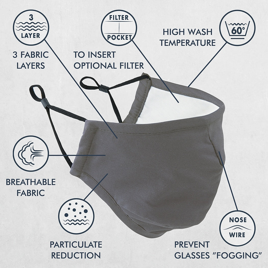 3-lags hudvennlig munnbind/ansiktsmaske i vevd bomull som muliggjør vask og gjenbruk. En pustende og figursydd ikke-medisinsk ansiktsmaske til bruk i det offentlige rom for å redusere partikler fra brukeren og omgivelsene. Vi anbefaler at masken vaskes før bruk. Produktet er testet i henhold til EN 14683:2019+AC:2019 ref. AFNOR SPEC S76-001.
