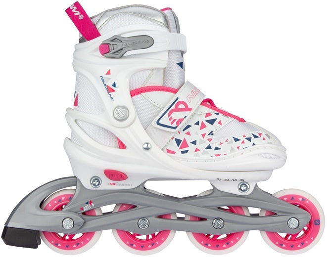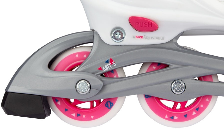 Flott rulleskøyte "White Wedge" med myk justerbar sko. Denne gir deg veldig god komfort, samtidig som den gir deg maksimal støtte i fot og ankelpartiet. Dette er en skøyte du kan ha på bena i mange timer under lek og morro og ikke minst treningsturer.