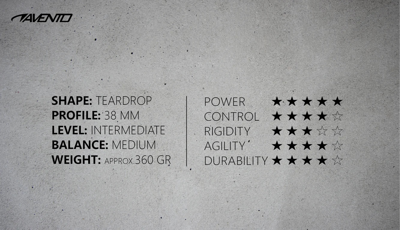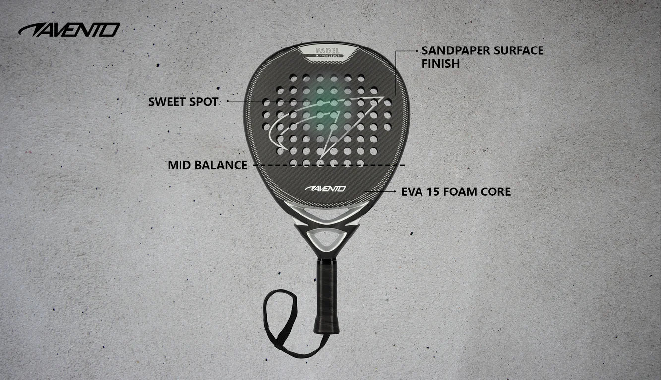 Gå for maksimal effekt: Vencedor-padelracketen har en dråpeform og en 3K karbonramme. I tillegg har denne racketen en dobbel bro, slik at racketen absorberer vibrasjoner godt og har mer stabilitet mens du treffer ballen. Rackethodet er 38 mm tykt og kjernen er laget av høykvalitets EVA 15-skum. Overflaten på racketen har en matt sandpapirfinish som gir deg et ekstra godt grep om ballen. Perfekt for å slå en sprettball for eksempel. Det ideelle treffpunktet til denne racketen, også kalt "sweet spot", er like over midten. Dette gir deg mer kraft, og 3K-karbonmaterialet i denne racketen holder deg i kontroll. «Middels balanse» i denne modellen gjør racketen manøvrerbar. Dette betyr at vekten er jevnt fordelt mellom grepet og toppen av racketen. Vencedor-racketen gir deg derfor maksimal kraft og en kraftig vibora, samtidig som du opprettholder manøvrerbarhet og kontroll som en mester. Avento Vencedor-racketen er utstyrt med et smart "hullsystem", som reduserer motstanden og øker hastigheten.