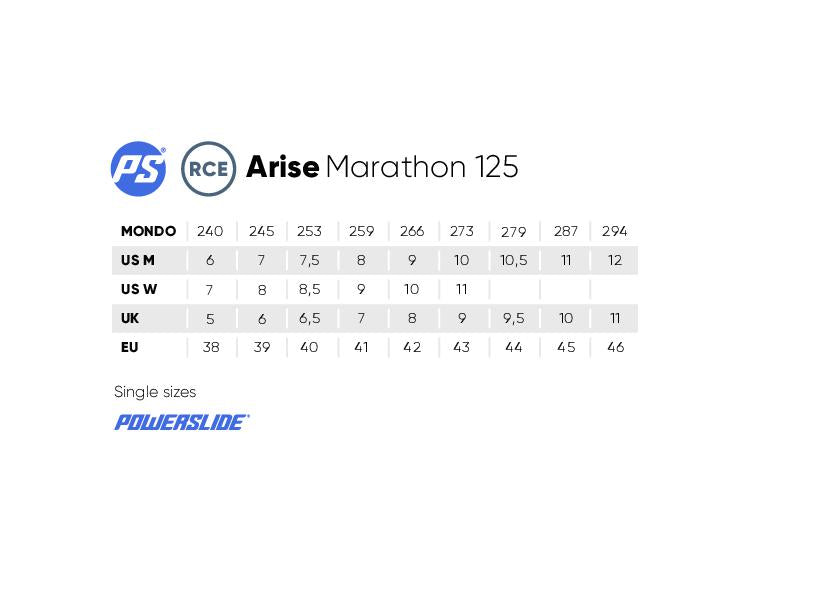 Skal du langt og komme dit raskt så er dette racerskøyten for deg. Når man bruker POWERSLIDE Arise Marathon rulleskøyten er det ingenting som kan hindre deg i presse egne grenser. En komfortabel prestasjonsskøyte. Arise Marathon er skøyte som er designet for å styrke resultater og fremme selvtillit. Selv ved de lengste løpene eller treningsrundene vil denne høye støvelen gi fantastisk støtte selv i høy fart. Noe som vil gi deg selvtilliten og kontrollen du trenger når det gjelder som mest. Skoen har karbon forskalling og Elite magnesiums-støpte rammer. POWERSLIDE Arise Marathon er lett slik at du kan bruke kreftene der det gjelder. Skøyten medfølger TRINITY 3-punktsmontasjesystemet som gir deg et lavt tyngdepunkt noe som forbedrer stabiliteten. TRINITY-systemet gir deg også muligheten til å stille inn rammen for å passe deg. En høy kvalitets skøyte trenger kvalitets deler. Som vises i skøytens UNDERCOVER 125 mm hjul med høykvalitets WICKED ABEC 9 kulelager. Perfekt for både landeveien og løp. Når hvert millisekund gjelder så er det bare POWERSLIDE Arise Marathon rulleskøyte som gjelder.