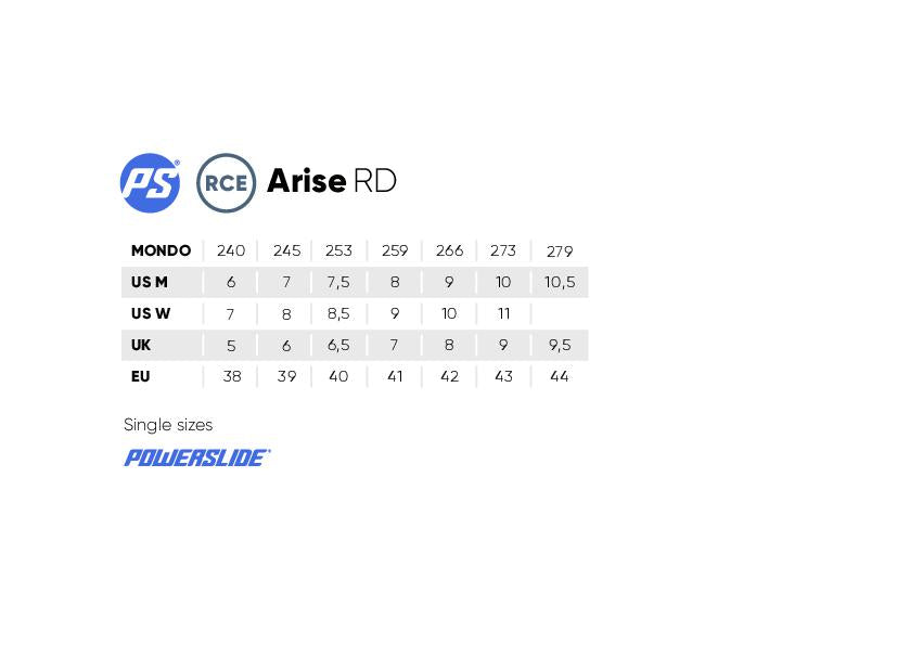 Powerslide Arise RD gir deg følelsene av en topp karbonløpskøyter med sidestøtten du trenger fra en treningsskøyte. Skoen er laget av karbon og har en passform som ligner på våre XXX 195mm Sko. Mansjetten vil gi deg all nødvendig støtte hvis du har vært redd for å prøve racingmodellen. Det attraktive designet gjør at du kan oppdage følelsen av de beste speedskøytene med stabiliteten til en klassisk treningsskøyte. Den 270 mm MG støpte rammen gir deg fortsatt ekstra smidighet. UHR-forbindelsen til UC-hjulene passer perfekt til ytelsesnivået du søker etter. Gjør deg klar til å slå rekorden når du løper på maraton eller bare oppdage den uanstrengte glidefølelsen.