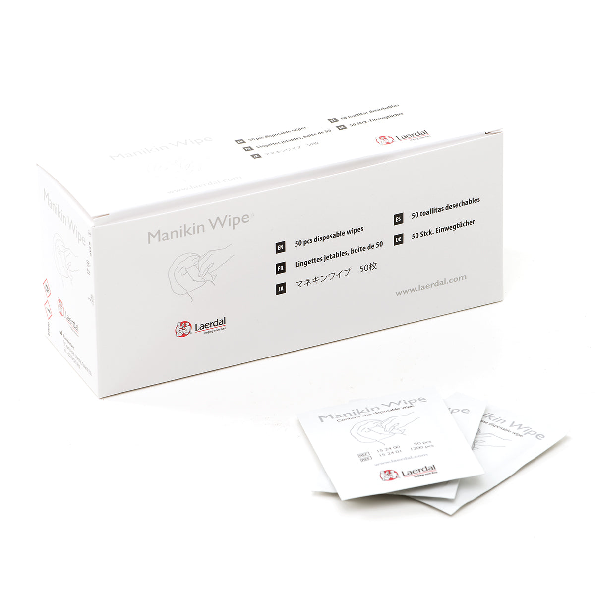 50-pack med våtservietter. Kan brukes blant annet ved hjerte-lunge-redning (HLR).