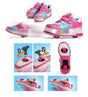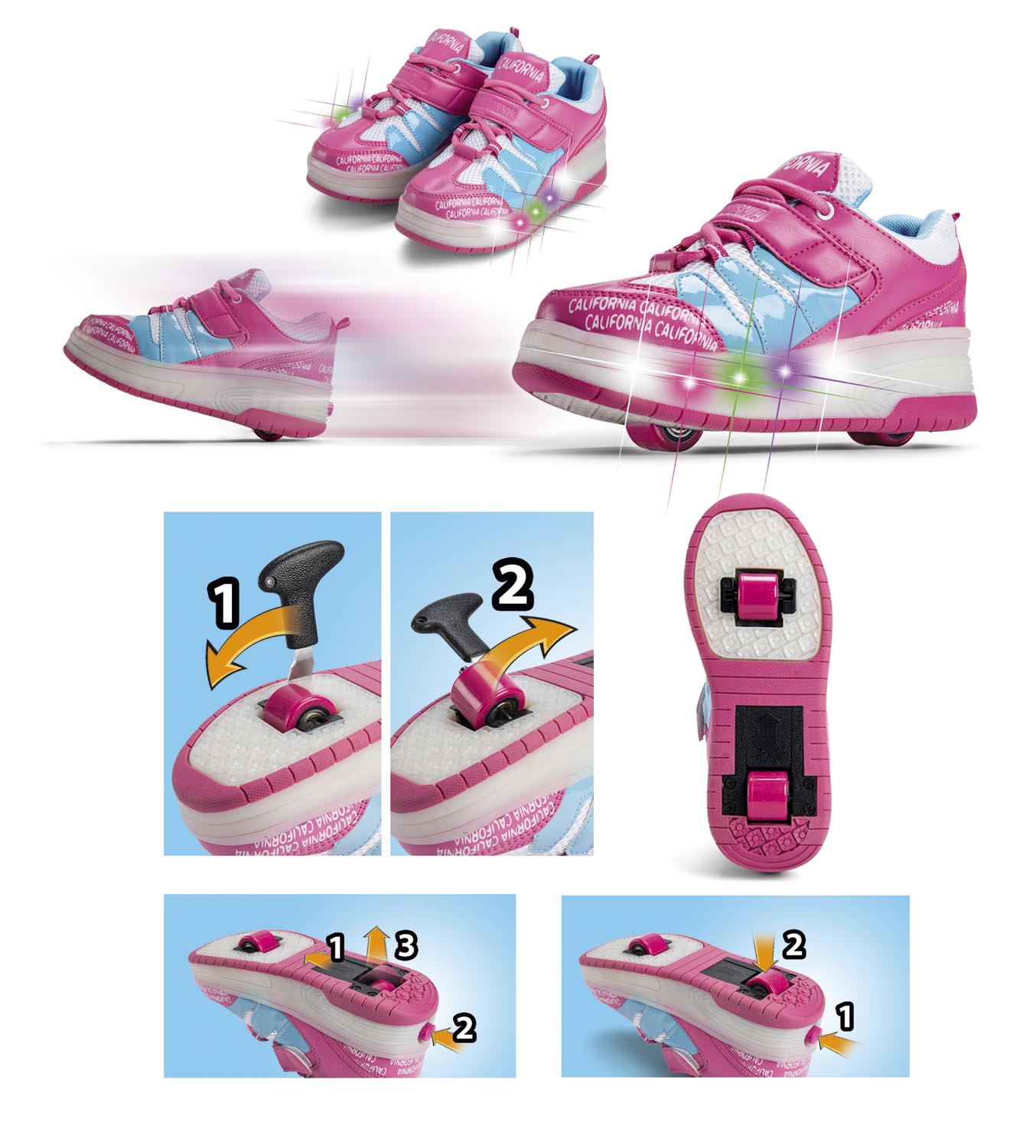 Rosa/hvit. California rollerboots Str. 28, 30, 32, 34 og 36. Blinkende lys i sålen. Pop-ut bakhjul som lett kan klikkes inn igjen. Skyvelokk over bakhjulet. Forhjulet tas ut med medfølgende verktøy. Lisse og borrelås.