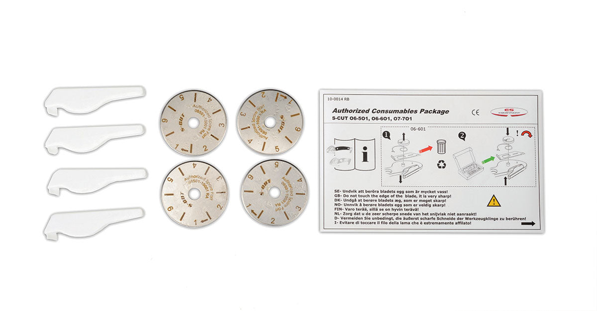 Når man bytter skjæreblad på S-cut og S-cut mini skal man alltid bytte beskyttelses deksel også. S-cut samlepakke består av 4 knivblader og 4 deksler.