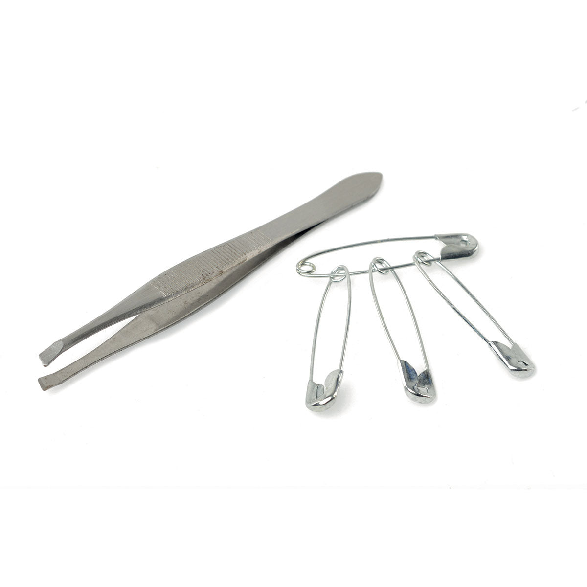 Pakning som består av 1 stk. pinsett og 4 stk. sikkerhetsnåler.