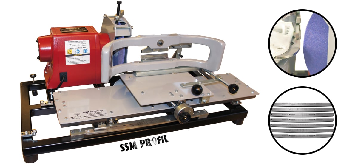 SSM PROFIL er en skøytesliper som er laget for profilsliping. Den største forskjellen til andre maskiner er at slipeskiven går loddrett. Dette gir mange fordeler ved profilsliping. Det som er viktigst er at det går mye raskere og gir høyere presisjon. Maskinen bruker slipeprofiler når du sliper skøyter; fire er inkludert i SSM PROFIL. Etterpå trenger du en SSM-2 eller SSM TT-3 for å gjøre den endelige slipingen (flat eller skålsliping) av skøyta. SSM PROFILE er tilgjengelig i en CE-godkjent versjon av 220-240 V og en ETL-godkjent versjon av 110-120 V.