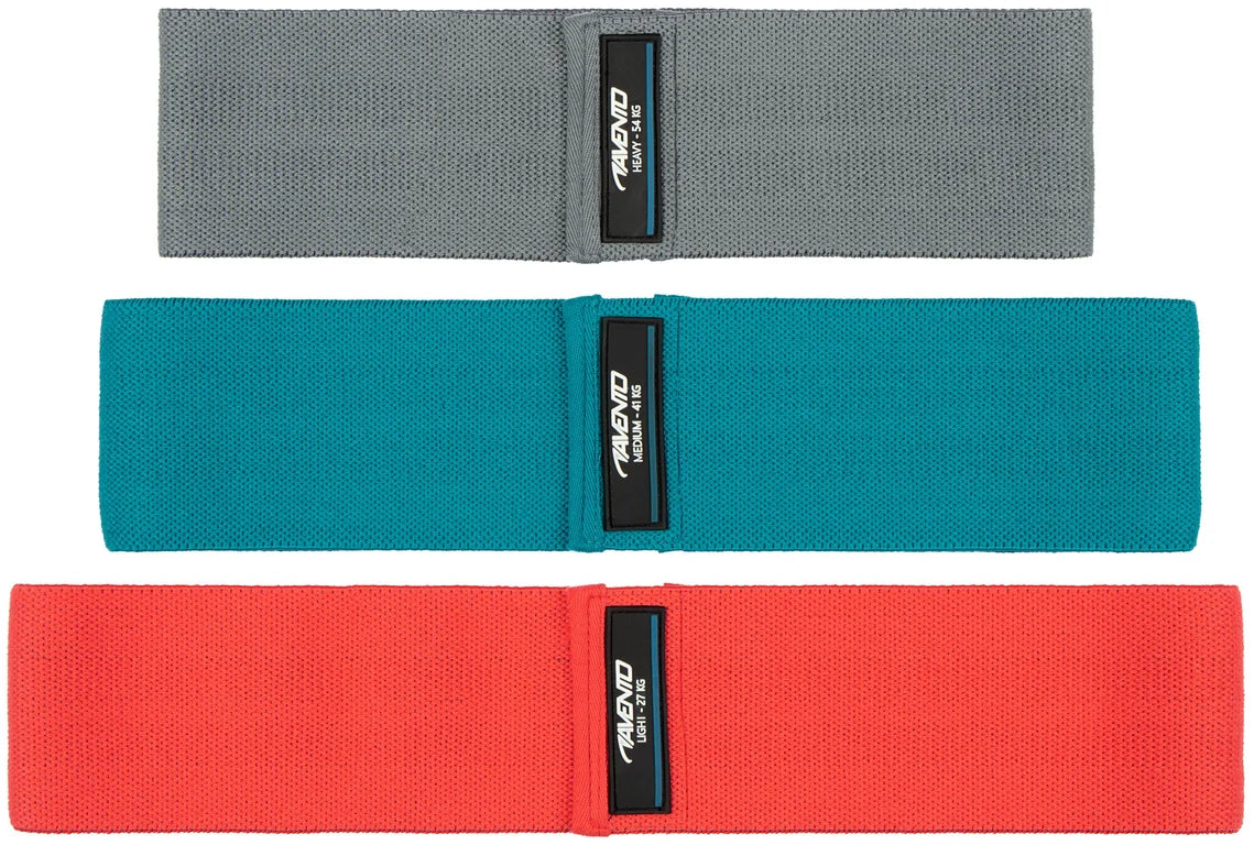 | Egenskaper | • myke elastiske motstandsbånd • sklisikker tekstur på innsiden • bredde: 8 cm • sett med 3 forskjellige motstandsbånd: lys (rosa): 27 kg trekkraft, lengde 32 cm middels (blå): 41 kg trekkraft, lengde 37 cm tung (grå): 54 kg trekkraft, lengde 42 cm |