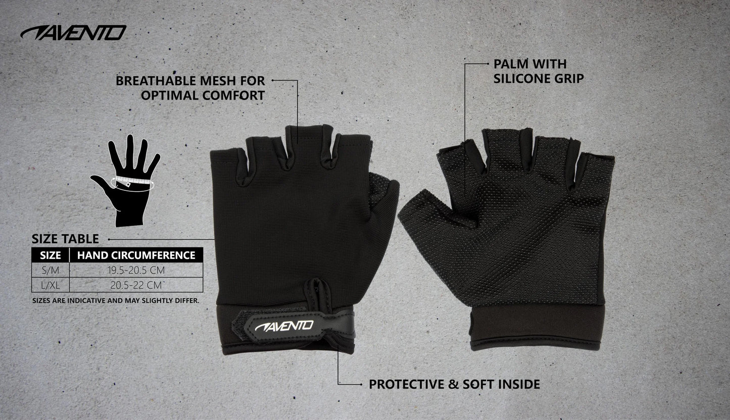 Trenger du hansker for bedre grep på sykkelen eller treningsutstyret? Da er Avento Fitness-hanskene perfekte for deg! Hanskene har en strekkinnsats mellom fingrene, noe som gir dem en bedre passform. Det er silikonpunkterr på håndflaten og på innsiden av fingrene, slik at hanskene gir et godt grep. Nettingen på toppen sikrer tilstrekkelig luftsirkulasjon og borrelåslukkingene gjør hanskene enkle å ta av og på.