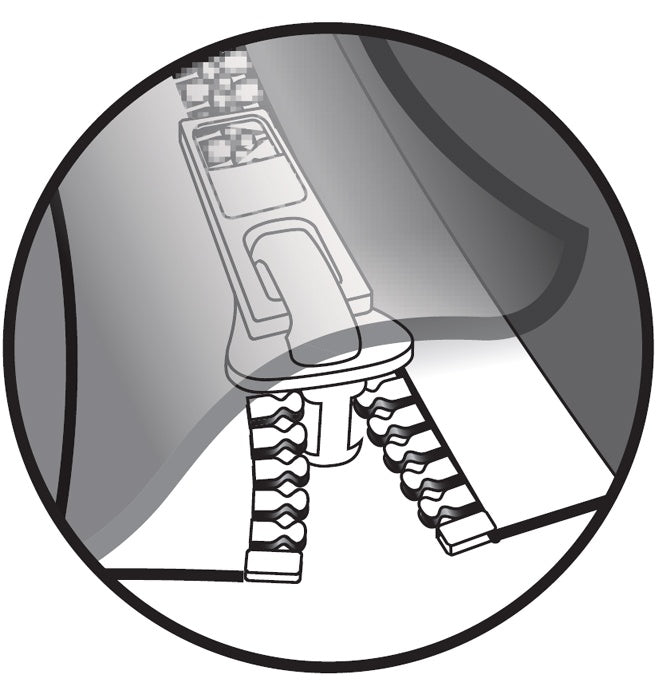 Frontåpning med glidelås beskyttet av et ovelappende stykke med borrelås.