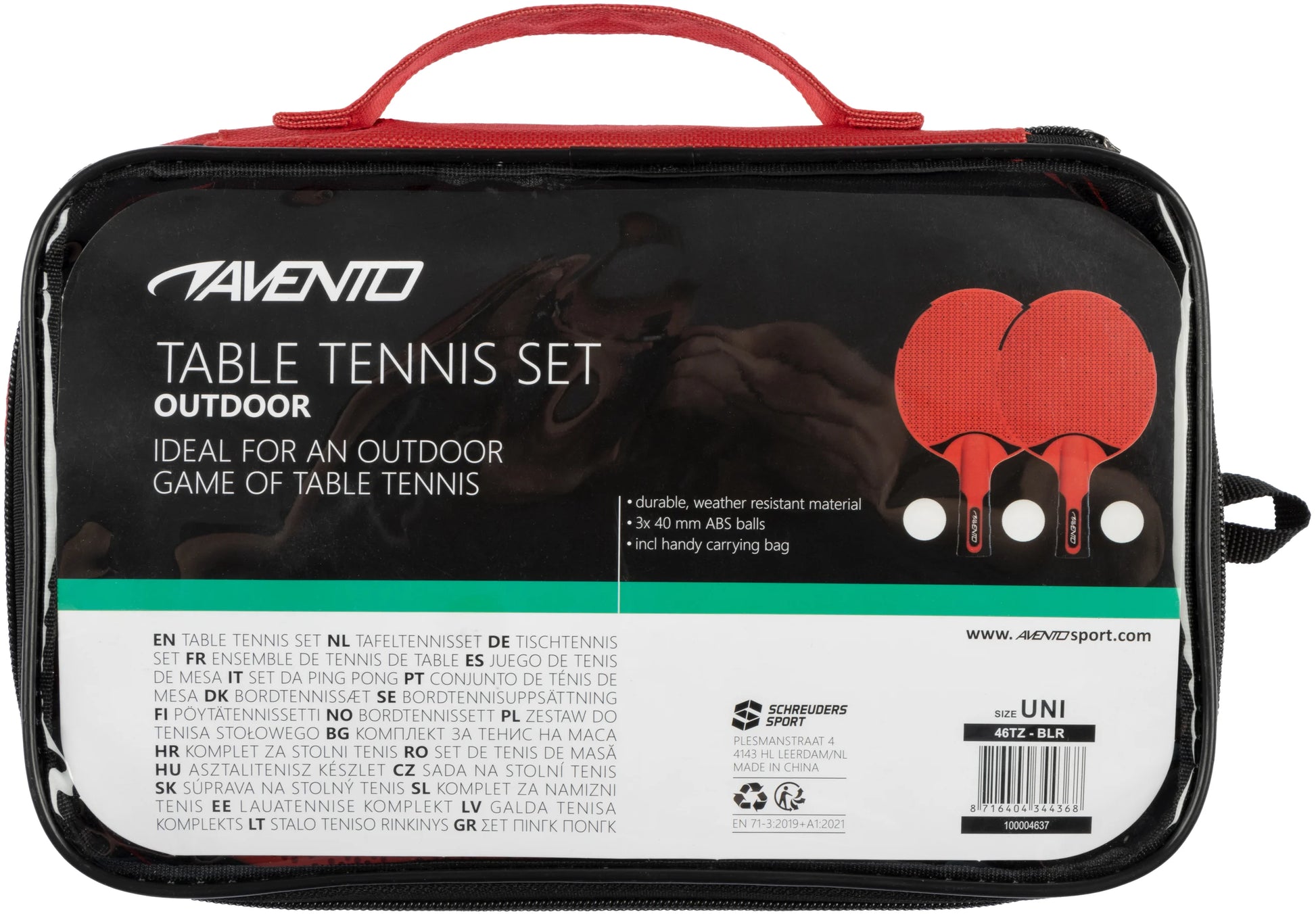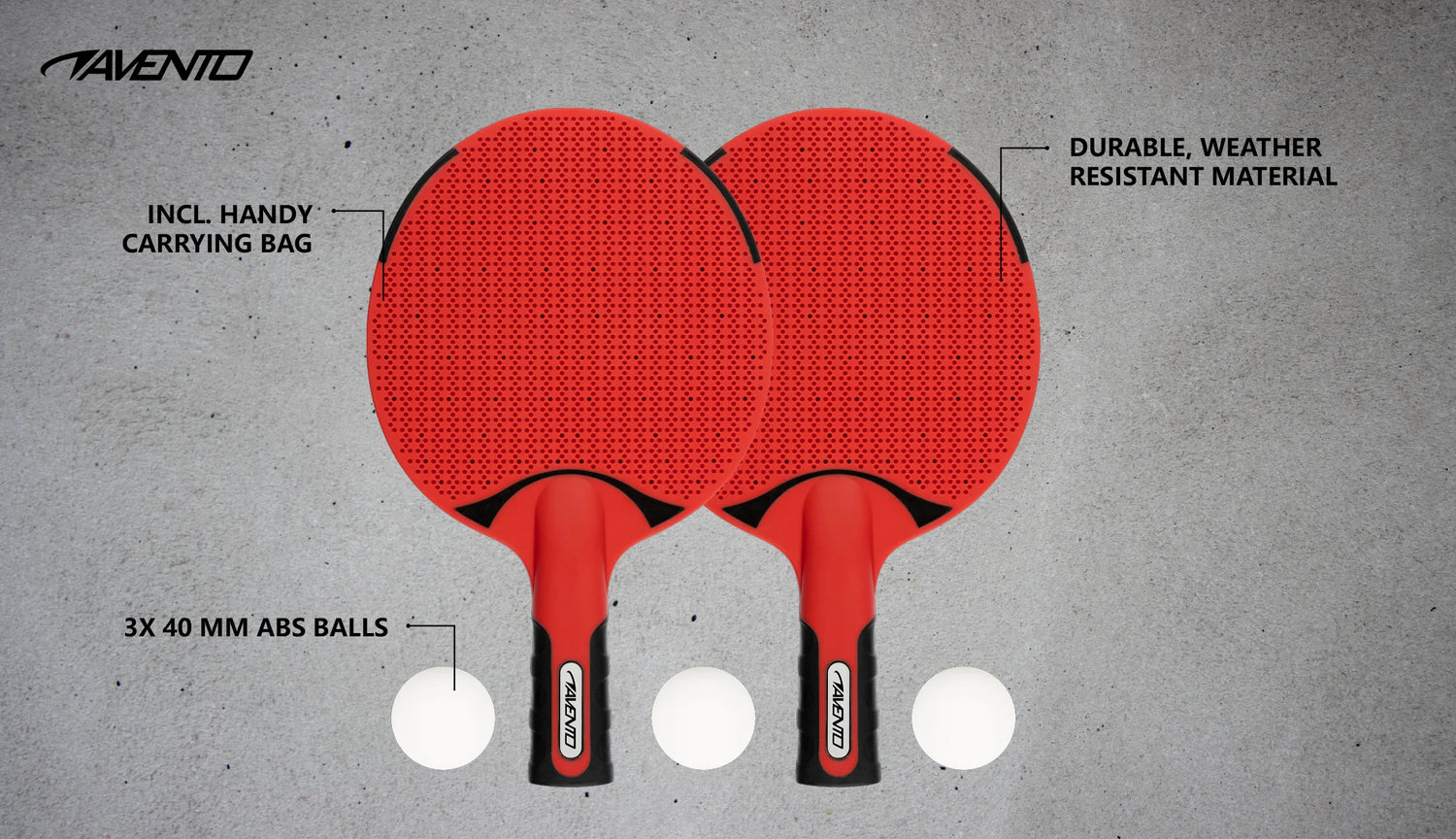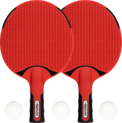 Liker du også å spille bordtennis med vennene dine i friluft? Dette bordtennissettet fra Avento er spesiallaget for utendørs bruk. Materialene av høy kvalitet er valgt slik at du kan nyte et slag bordtennis i alle værforhold. De allsidige bordtennisbattene i dette settet er laget av slitesterk PP. Dette sikrer at flaggermusene er ekstra solide, tåler juling og er vann-/regnsikre. Pingpong-flaggermusene har anatomiske håndtak for godt grep, noe som gjør det enkelt å bytte fra forehand til backhand under spill. Bladet til flaggermusene har et topp- og bunnlag av gummi, for god ballkontroll. Settet kommer med to balltre og tre ABS bordtennisballer. Bordtennisballene har en diameter på 40 mm.