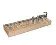 Put tool number 1 into the hole of the hook 12 and fasten it using the nut that is included. Loosen the Allen screw in the tool holder 11 and fasten tool number 4 (hole is Ø8 mm). Position the skate above the hook 12 so that you can feel tool number 1 in the rivet. Lower the tool holder 11 so that the tool 4 fits around the head of the rivet. Press down and the rivet should come loose. It will not come completely free; remove it with a pair of tongs.